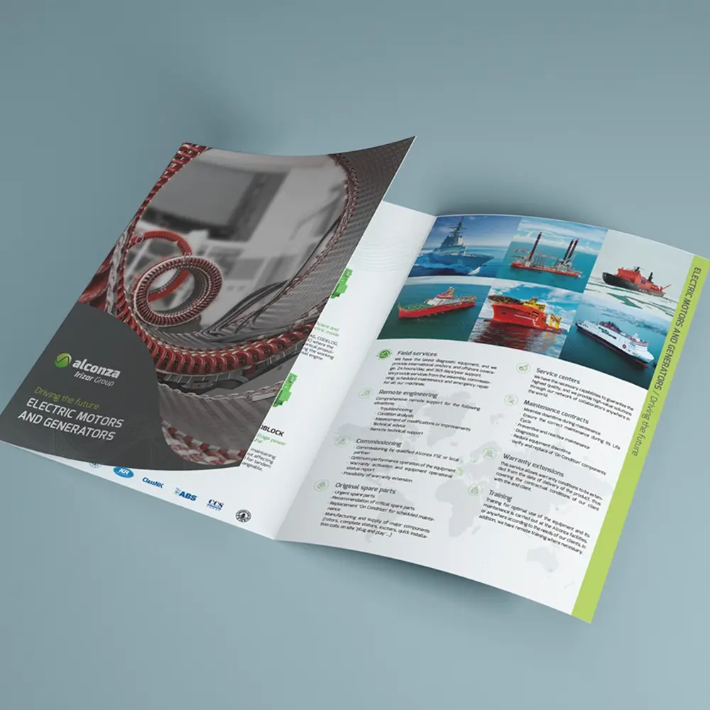 n Coneklab desarrollamos proyectos de diseño gráfico industrial orientados a mejorar la comunicación técnica y comercial de empresas B2B. Uno de estos proyectos fue la creación de un folleto corporativo y técnico para Alconza, compañía con sede en Berango (Bizkaia) especializada en el diseño y fabricación de motores y generadores eléctricos para aplicaciones industriales, marinas, hidroeléctricas y de electromovilidad.